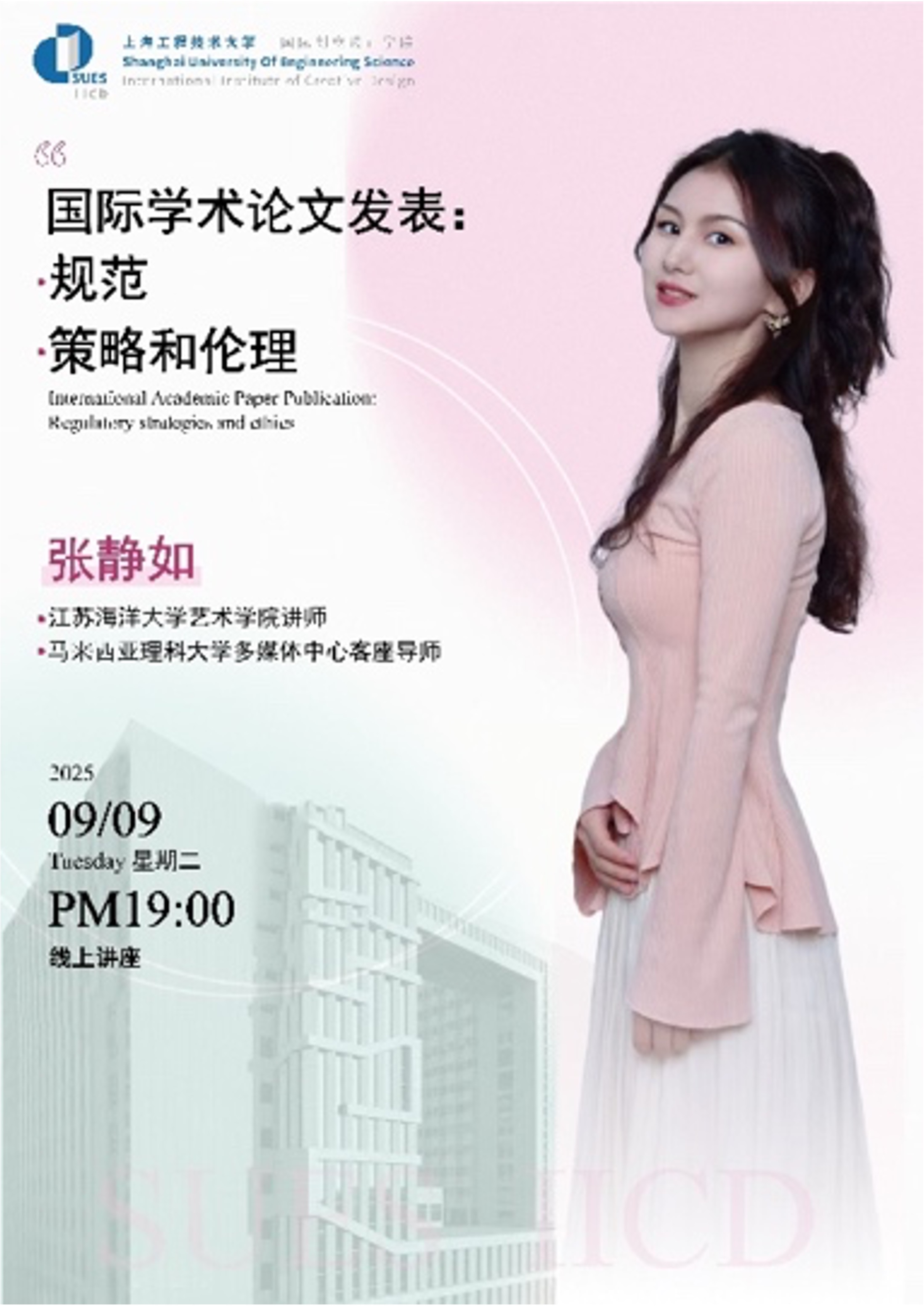 2025年9月9日,bw必威西汉姆联官网首页以线上形式举办“国际学术论文发表:规范、策略和伦理”专题讲座。此次讲座特邀江苏海洋大学艺术学院讲师、马来西亚理科大学多媒体中心客座导师——张静如老师主讲,针对投稿流程规范、审稿意见处理技巧及研究方法等方面进行分享。本次讲座面向2025级研究生新生,由赵悦扬老师主持,樊荣老师、王郅老师和王冠夷老师等共同参与。