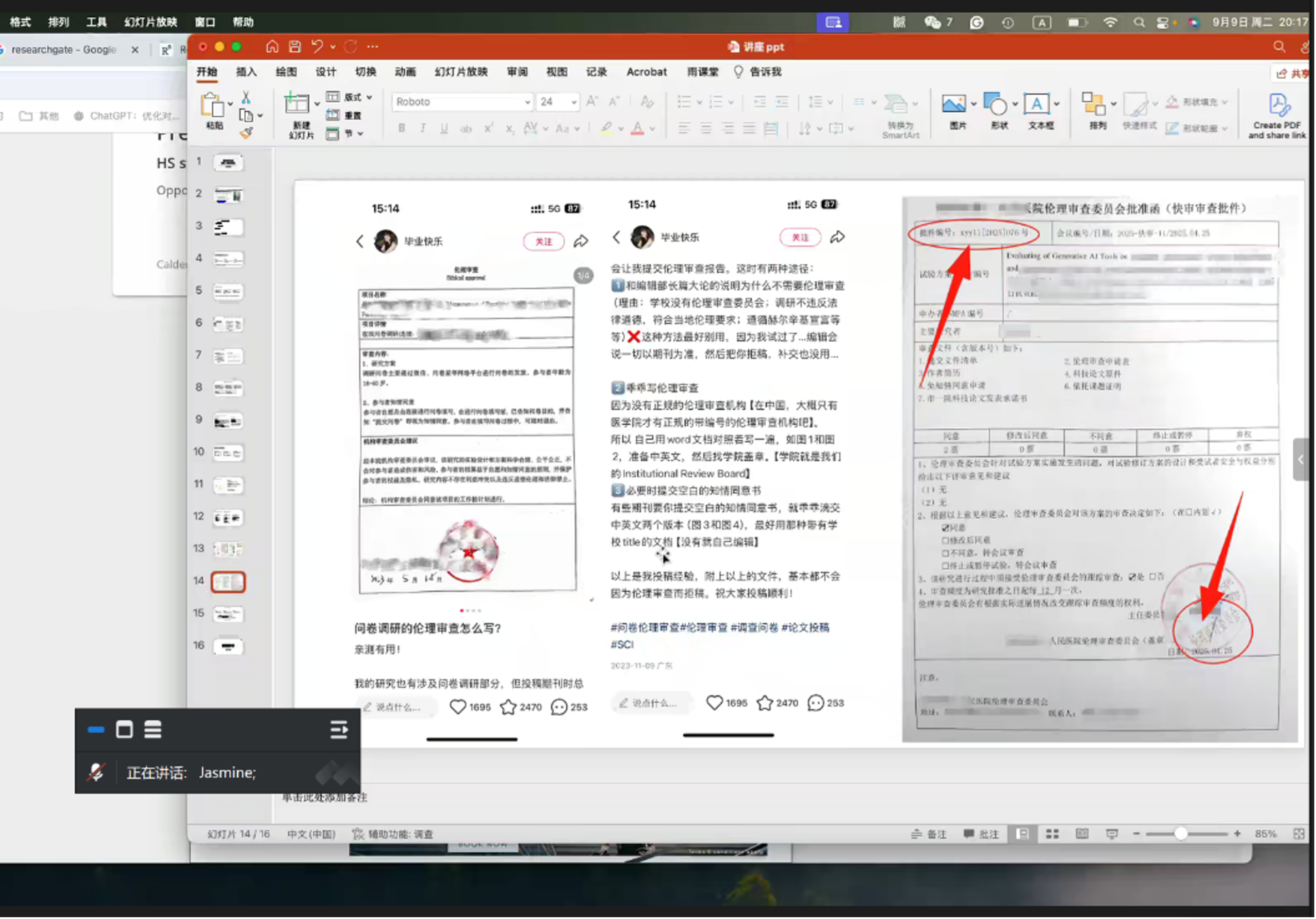 关于学术伦理,张静如老师通过案例分析强调学术伦理审查的必要性,详细解析了OA期刊运作机制与审稿人激励制度,她指出当前SCI/EI期刊投稿量激增(每月数千篇),伦理审查成为初筛核心标准,如无审查可能会直接拒稿。自2023年起期刊审查升级后,小红书等平台提供的“科研处盖章”方案已失效,需伦理委员会正式批准函及唯一稿件编号。