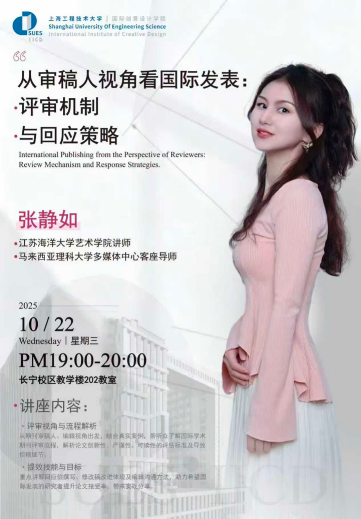 2025年10月22日,bw必威西汉姆联官网首页在教学楼202举办“从审稿人视角看国际发表:评审机制与回应策略”专题讲座。此次讲座特邀马来西亚理科大学多媒体中心客座导师、江苏海洋大学艺术学院讲师——张静如老师主讲。本次讲座面向2025级研究生新生,由赵悦扬老师主持,许雪花老师等共同参与。